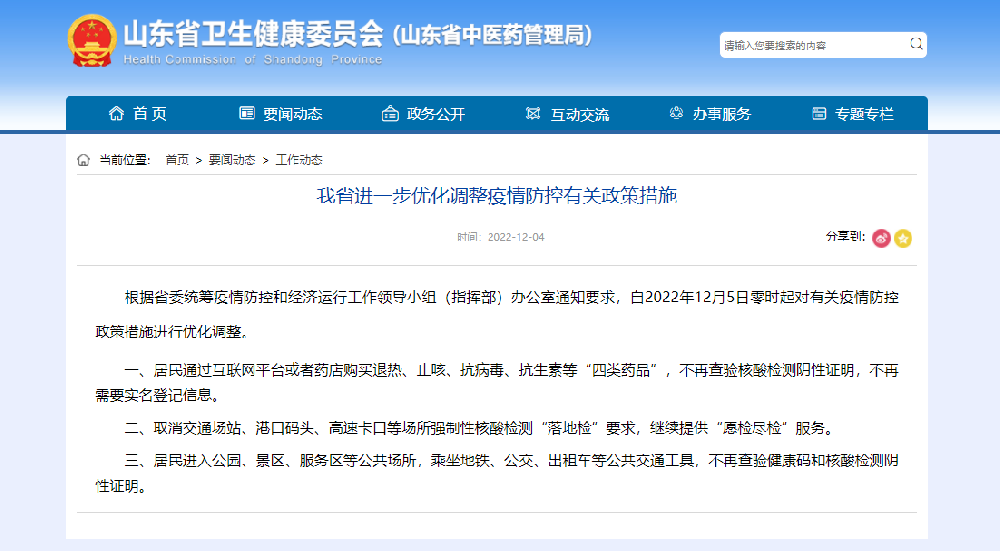 12月4日,山東省衛(wèi)健委發(fā)布消息:根據(jù)省委統(tǒng)籌疫情防控和經(jīng)濟(jì)運(yùn)行工作領(lǐng)導(dǎo)小組(指揮部)辦公室通知要求,自2022年12月5日零時起對有關(guān)疫情防控政策措施進(jìn)行優(yōu)化···